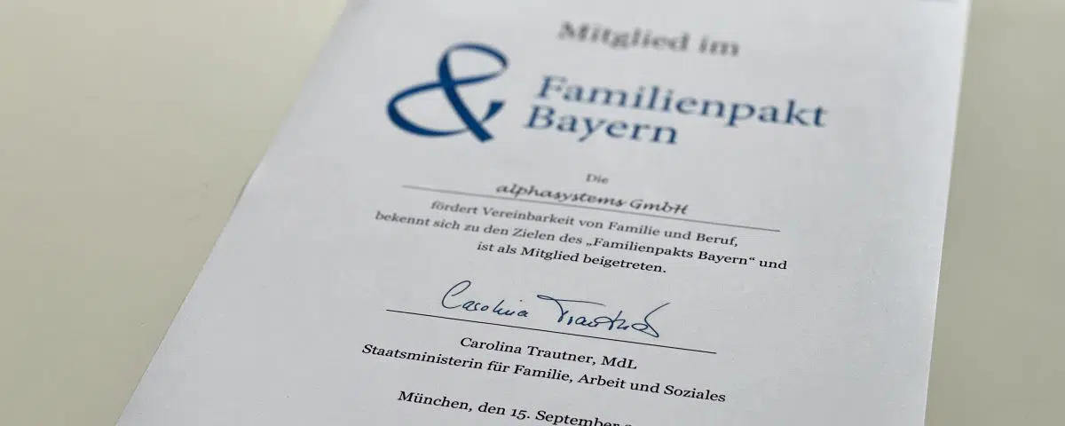 Die alphasystems ist seid Kurzem Mitglied in der bayernweiten Initiative „Familienpakt Bayern“. Diese Mitgliedschaft war der konsequente Schritt für uns, um auch nach außen zu zeigen, dass es schon seid Jahren unser Anliegen ist, Familienfreundlichkeit nachhaltig zu etablieren.